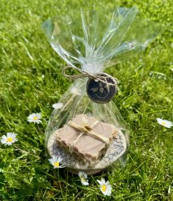 Honigseife Set, bestehend aus einer Honigseife und einer handgefertigter Ton Seifenschale in einer Geschenk Verpackung.