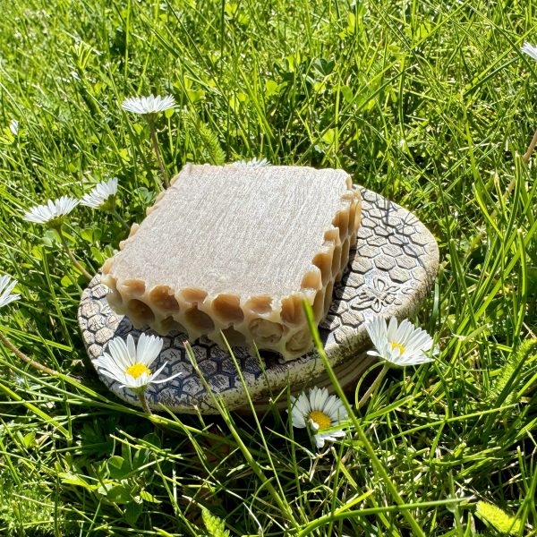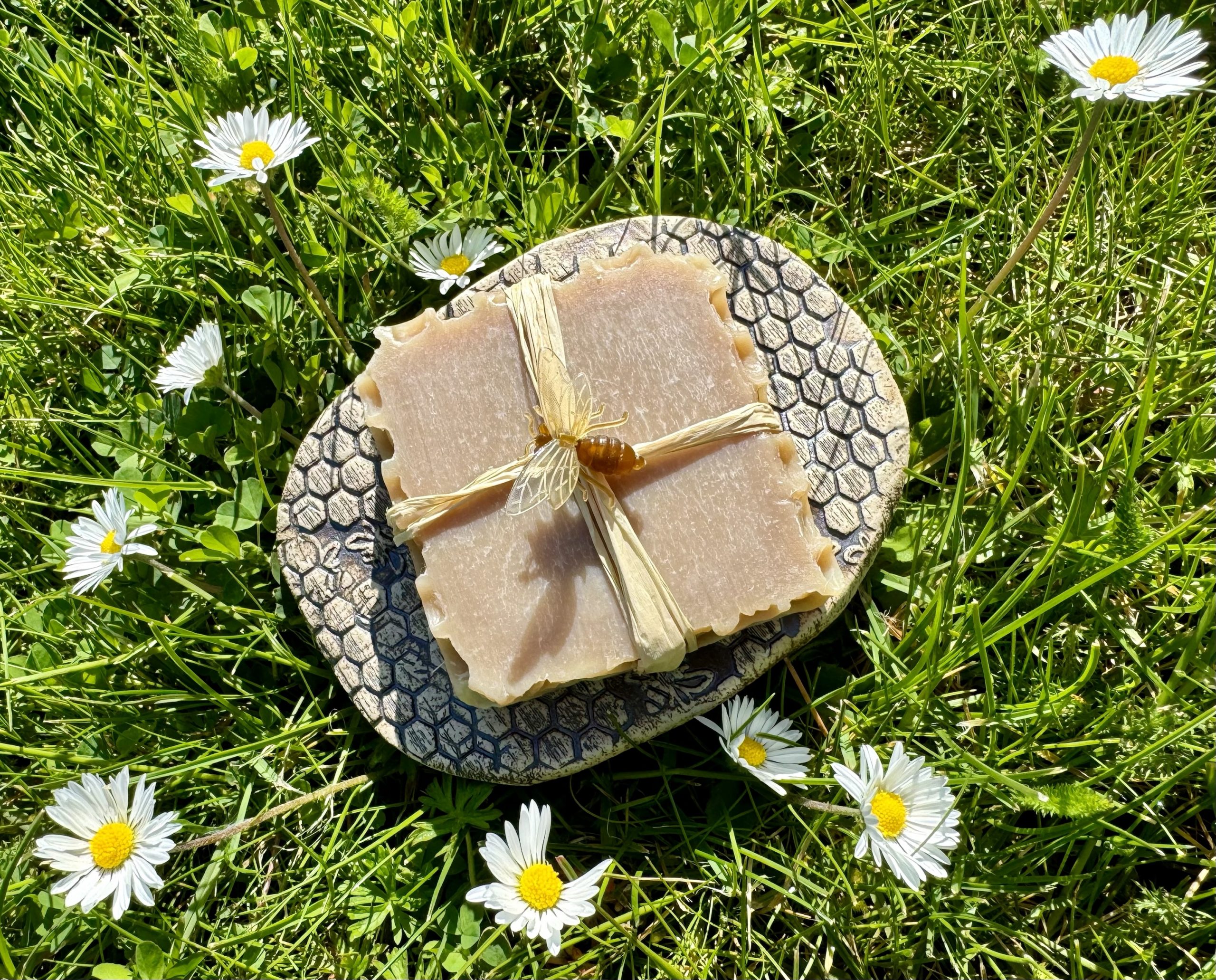 Honigseife Set, bestehend aus einer Honigseife und einer handgefertigter Ton Seifenschale in einer Geschenk Verpackung.