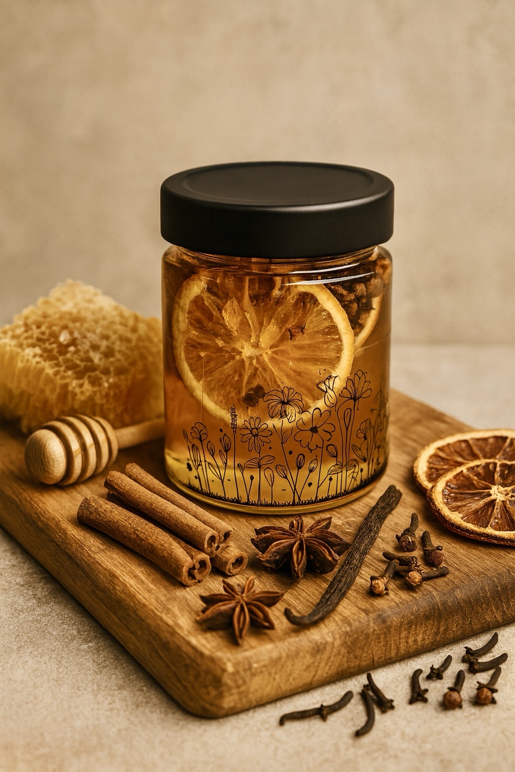 Beim Öffnen entfaltet sich ein warmer, festlicher Duft, der an gemütliche Winterabende erinnert. Der Honig eignet sich ideal zum Verfeinern von Tee, Punsch, Glühwein oder Desserts – oder einfach pur als süßer Seelenwärmer.